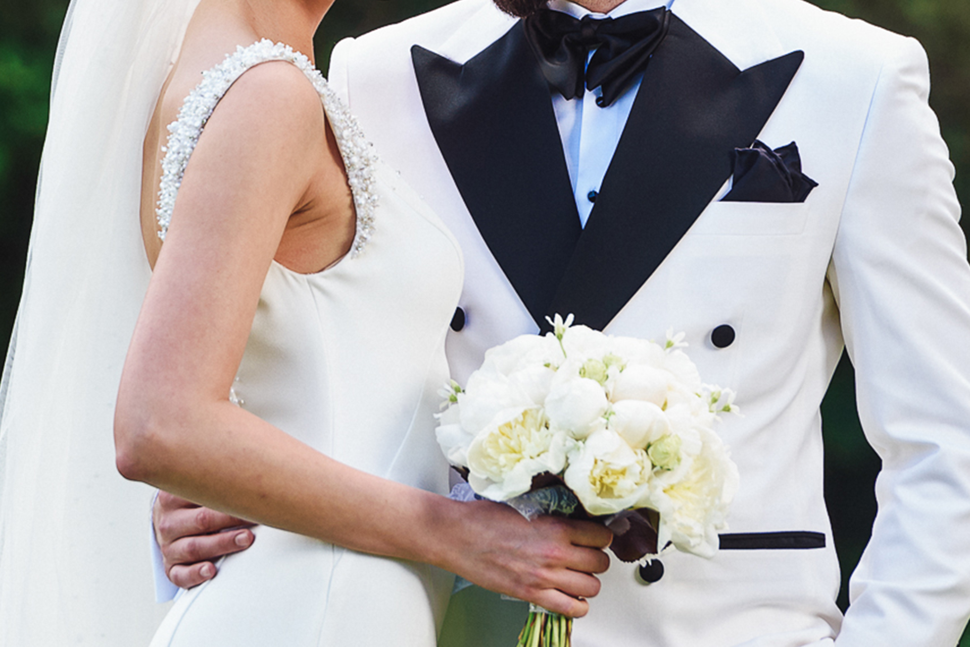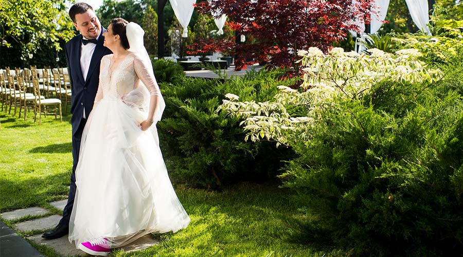 Traian si Oana au mizat la nunta lor pe simplitate sarmanta si pe atemporalitatea costumului clasic. Astfel, costumul sau bleumarin cu rever spit, camasa impecabila si papionul clasic negru au pus in evidenta eleganta ei tinereasca si alegerea nonconformista la capitolul incaltaminte.