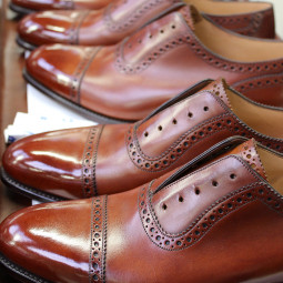 Loake Shoemakers, English shoe manufacturer, was started in 1880 by three brothers, five generations later being still family-owned and managed. As a supplier of shoes to the Royal household, Loake has a Royal Warrant of Appointment to the Queen. Loake is most proud of the craftsmanship and attention to detail that goes into its Goodyear Welted shoes, production that takes approximately eight weeks. The process involves some 130 skilled craftspeople, 75 shoe parts and 200 handcrafted operations. For finishing, Loake shoes undergo up to eleven different polishing operations all executed by hand.